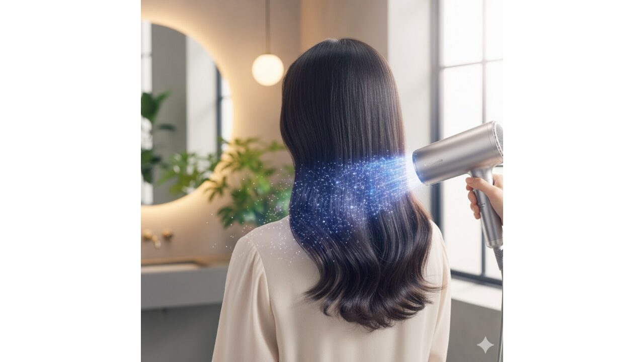 プラスとマイナスの両イオンを同時に放出するのが最大の特徴です。これらのイオンが髪表面で結合し、水分子のベールを形成。この「水分子コート」がキューティクルを保護し、外部の刺激や乾燥から髪を守ります。結果として、うるおいが長時間持続し、サラサラとした手触りを実現します。